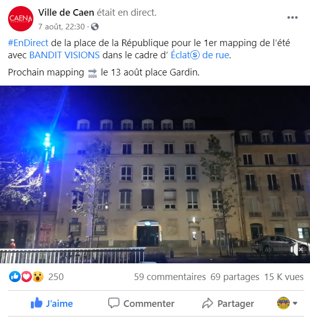 Face à la crise sanitaire inédite qui touche tous les secteurs d’activités et particulièrement le monde du spectacle, Bandit Visions a proposé durant tout l’été plusieurs rendez-vous intimistes au cœur du centre-ville de Caen. Les créations graphiques mettant en valeur les différents bâtiments ont proposé aux résidents et aux quidams de passage un récit composé d’animations oniriques accompagné d’une musique originale pour les quatre lieux de diffusion suivant : Place de la République, Place Gardin, bibliothèque Alexis de Tocqueville et Place Saint Sauveur.